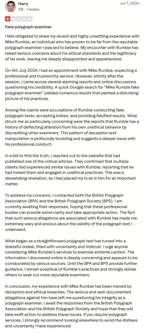 This person took the appropriate step of reporting their concerns to both the British Polygraph Association (BPA) and the British Polygraph Society (BPS), demonstrating how seriously these allegations should be taken.
